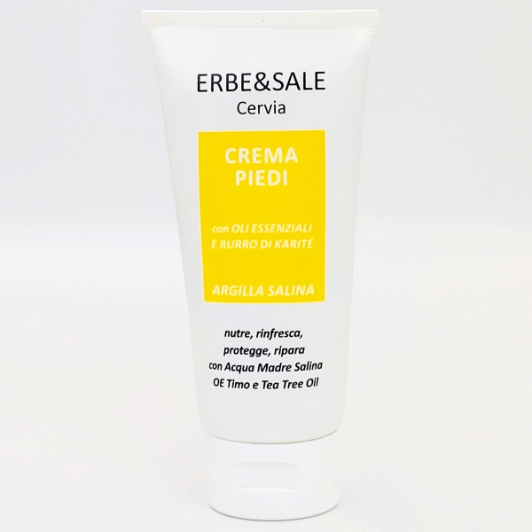 Crema per piedi secchi, screpolati, lesi, stanchi e accaldati, nutre e non unge, a base di Argilla Salina e Acqua Madre Salina, dalle proprietà lenitive e riequilibranti, con Burro di Karitè super nutriente, ed oli essenziali di Timo e Tea Tree dalle proprietà antisettiche e antimicotiche per contrastare cattivi odori e micosi