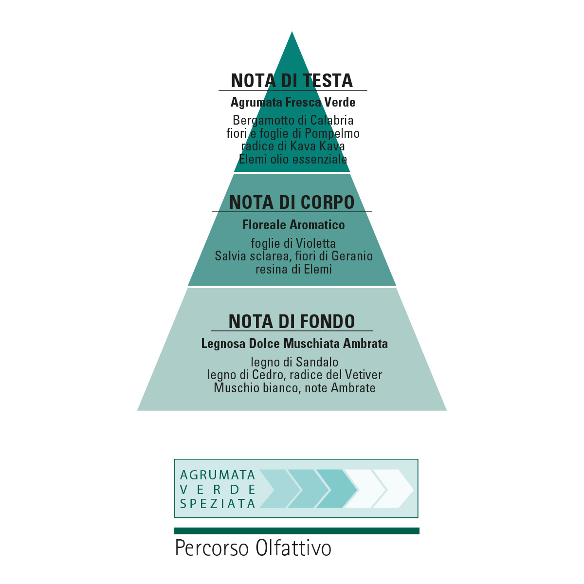 L'equilibrio dell'olio essenziale e della gommoresina, estratti dal tronco maestoso dell'Elemì, si amalgama all'aroma speziato della radice di Kava kava, mentre l'odorosa Salvia sclarea e cristalli di Mentolo ne esaltano l'aspetto fresco, aromatico, per poi scivolare nel cuore con una originale presenza floreale, inattesa per i canoni tradizionali di un profumo maschile, ma che fa veramente la differenza: la sensualità delle foglie di Violetta, la verde delicatezza dei fiori di Geranio sono rafforzate dalla fisicità asciutta del legno di Cedro che si fonde nel legno di Sandalo per assicurare un cuore solido, affidabile ed esigente fortificato dalla radice del Vetiver.