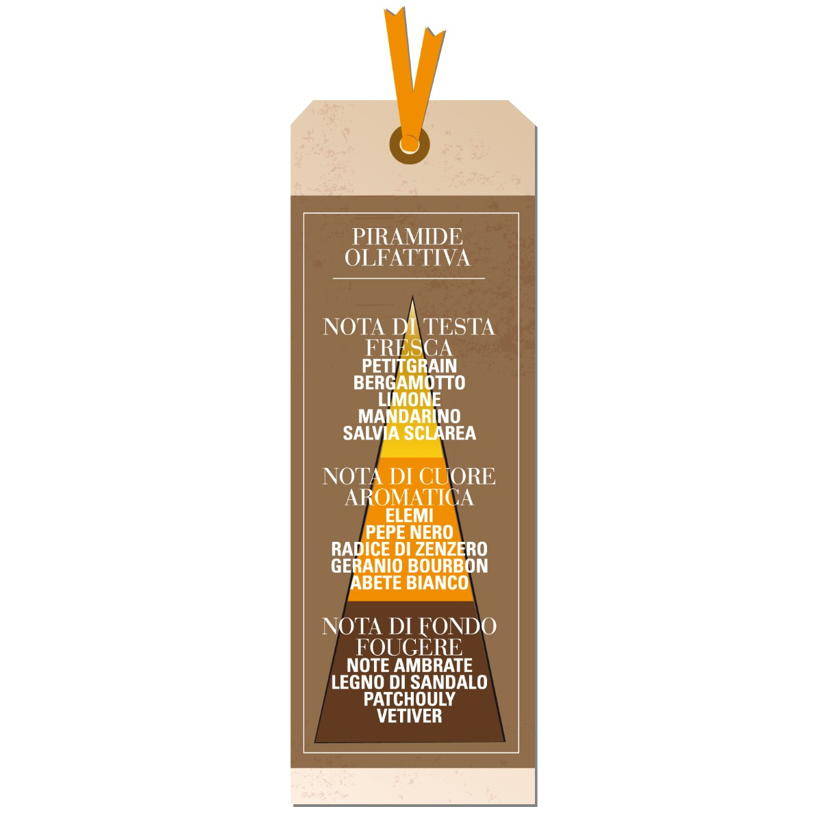 Un accordo iniziale, vivace e luminoso, di agrumi mediterranei: Bergamotto, Limone e Mandarino si amalgamano alla delicatezza del Petitgrain e delle sommità fiorite della Salvia sclarea donando una dinamica freschezza preludio dell'equilibrio che si manifesterà compiutamente nel cuore di questa esaltante costruzione olfattiva. L'esordio vivace si stempera nell'aroma calmante dell'Elemi galvanizzato da una nota frizzante di Pepe nero e radice di Zenzero con un tocco fragrante di foglie di Geranio Bourbon per equilibrarsi nella scia dell'Abete bianco. Intenso e persistente il fondo dai toni fougère e pregiati del Patchouly, del Vetiver di Haiti e del legno di Sandalo, arrotondati da morbide sfumature ambrate per un'inconfondibile impronta olfattiva.