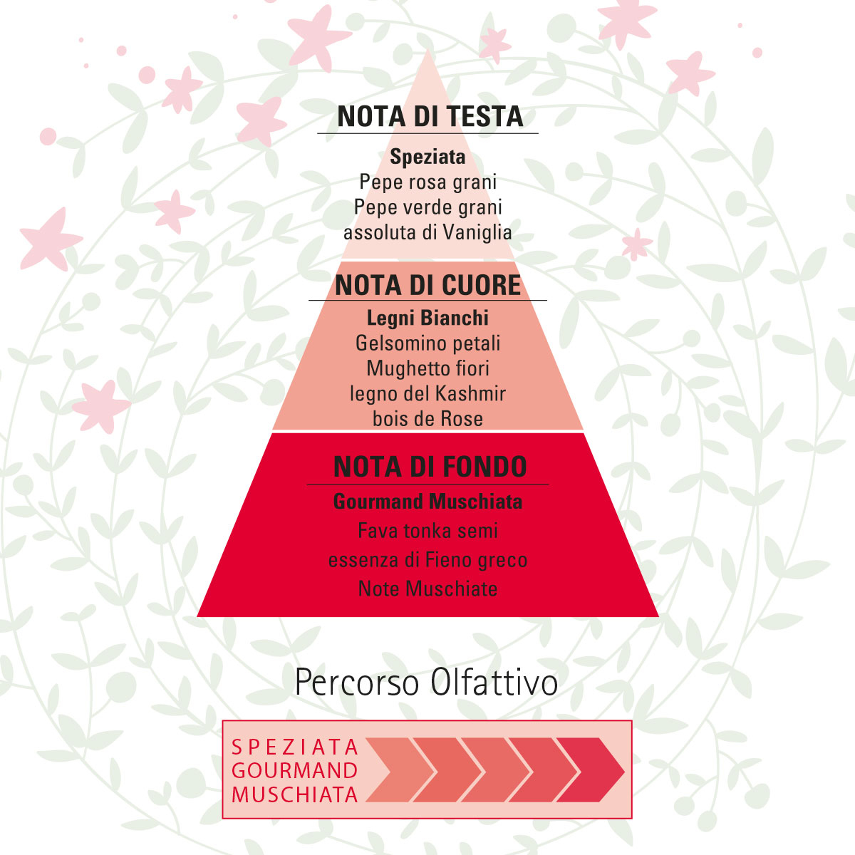 L'ouverture si sprigiona con le note di testa, intense e aromatiche dell'essenza di Pepe rosa originario del Madagascar in accordo con quelle vibranti e luminose del Pepe verde mentre l'assoluta di Vaniglia, travolgente, conferisce un carattere sensuale e una tonalità leggermente poudré.